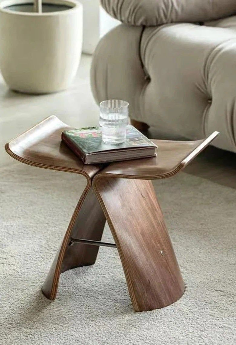 Стул состоит из двух идентичных по форме изогнутых частей, соединенных вместе латунным стержнем, что ассоциативно напоминает крылья бабочки. Основная концепция — союз между Востоком и Западом. Вероятно, что французский студент Янаги при создании стула был вдохновлен западной мебелью, так как такого вида мебели как табурет, в японской культуре не существует (традиционно сидят на полу, используя татами). Для своего изобретения Янаги использовал технику гнутой фанеры, которая очень популярна в работах Имзов и Якобсена. Форма этого восточного табурета напоминает не только насекомое, но и японские иероглифы, а также ворота тории, которые обозначают вход в синтоистские святилища. Табурет по-прежнему широко используется, его вполне можно применять в качестве журнального столика. В последний раз я видела его в салоне Fifth Avenue.